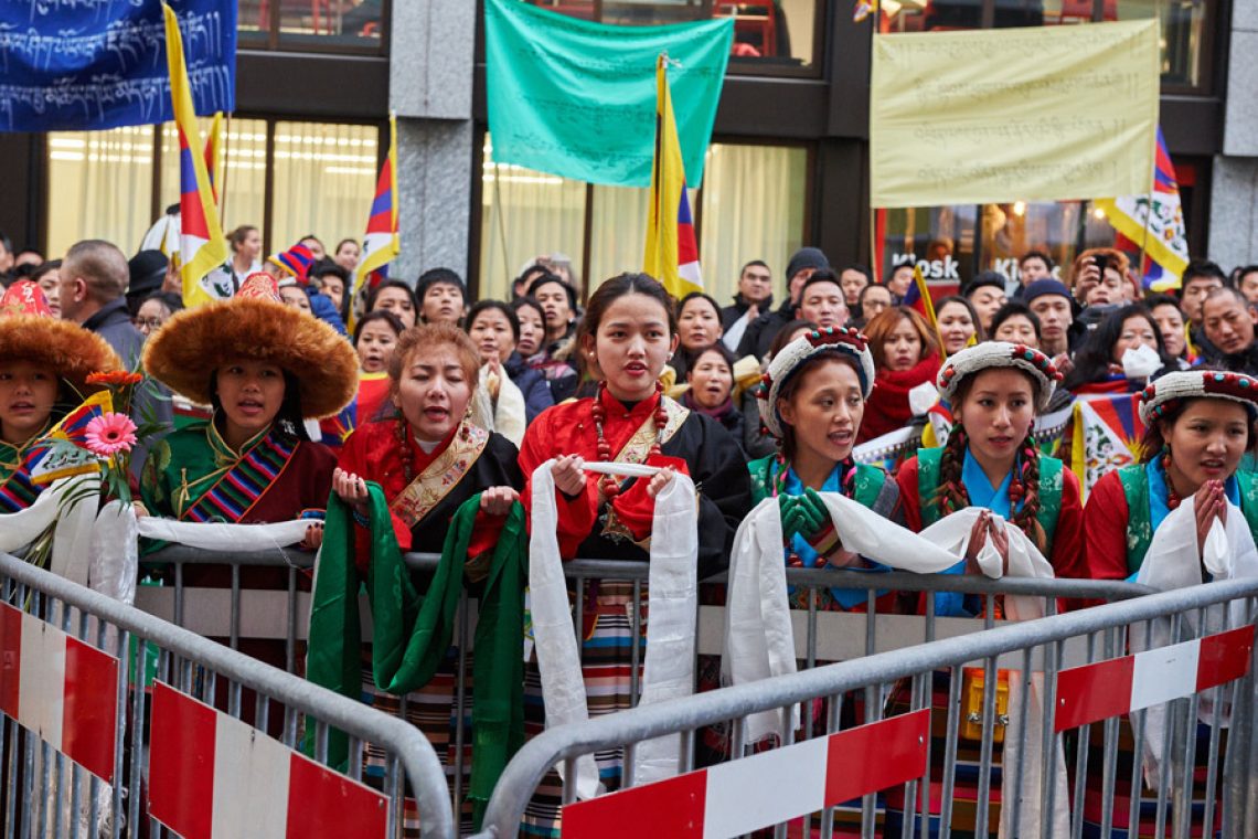 Miembros de la comunidad tibetana ofreciéndole a Su Santidad el Dalái Lama una bienvenida tradicional a su llegada a su hotel en Basilea, Suiza, el 6 de febrero de 2015. Foto/Olivier Adam