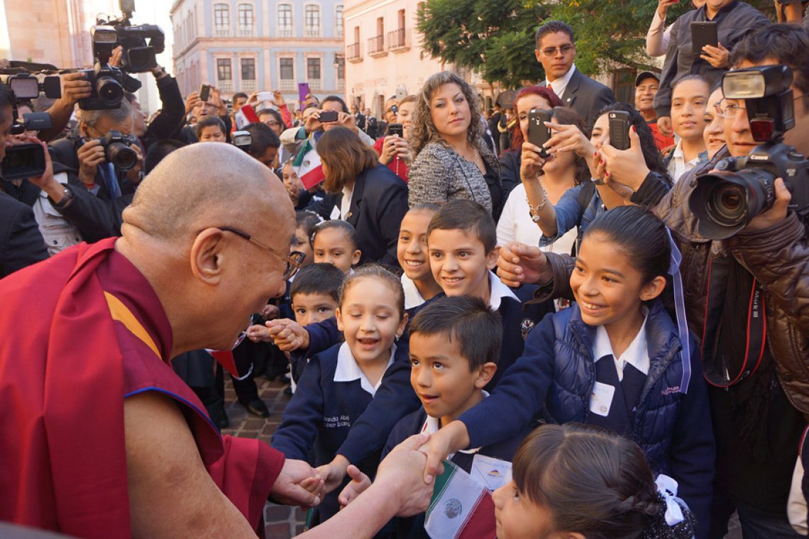 Escolares saludan a Su Santidad el Dalái Lama a su llegada al Antiguo Templo de San Agustina en Zacatecas, México, el 16 de octubre de 2013. Foto/Jeremy Russell/OHHDL